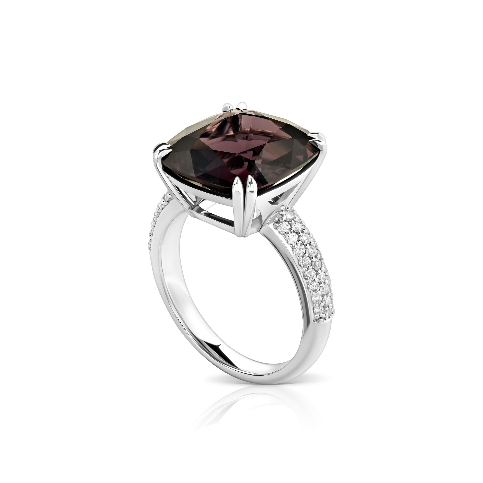 Кольцо со шпинелью от ювелирной дизайн-студии Parure Atelier — это элегантное сочетание благородных материалов и тонкого мастерства. Центральный камень, шпинель насыщенного фиолетового оттенка Purple, весом 9.63 карата, выполнен в огранке кушон, которая подчеркивает глубину его цвета и изысканный блеск. Металлическая основа изделия выполнена из белого золота 750 пробы, создающего идеальный фон для центрального камня.
