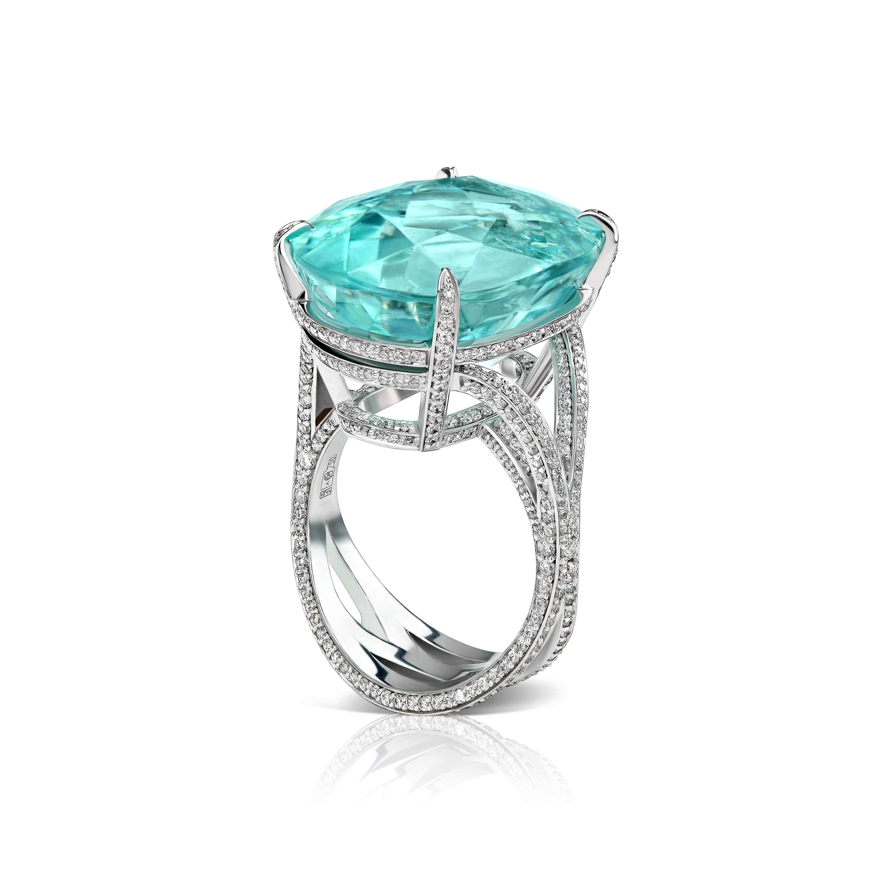 Артикул: R1746Кольцо «Star of Riviera» украшено крупным турмалином Параиба весом 23.9 карата, который привлекает внимание своей насыщенной голубой гаммой и прозрачностью. Овальная огранка камня позволяет максимально раскрыть его природное сияние и глубину цвета. Аккуратные крепления из белого золота надежно фиксируют центральный камень, придавая изделию современный и лаконичный облик. По бокам размещены мелкие бриллианты, которые дополняют композицию, подчеркивая изящество и аккуратность дизайна. Такое сочетание природного минерала и ювелирного мастерства делает украшение гармоничным и выразительным. Данное изделие создано в Ювелирной дизайн-студии Parure Atelier, где особое внимание уделяется качеству и деталям.