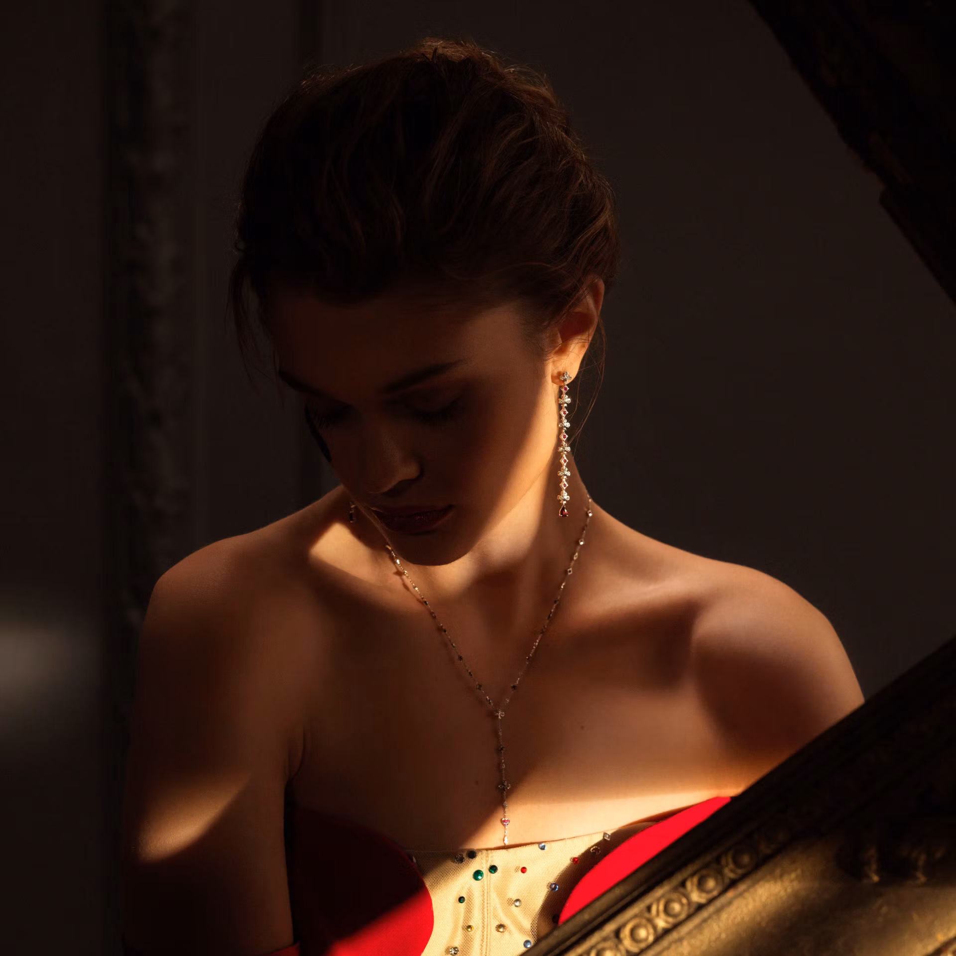Центральный камень — бриллиант, окруженный мерцающими рубинами, которые подчеркивают его блеск и глубину. Гранат придает украшению насыщенность и богатство оттенков, создавая неповторимую игру света. Общий вес камней составляет 1.12 карата, что добавляет изделию утонченной роскоши.