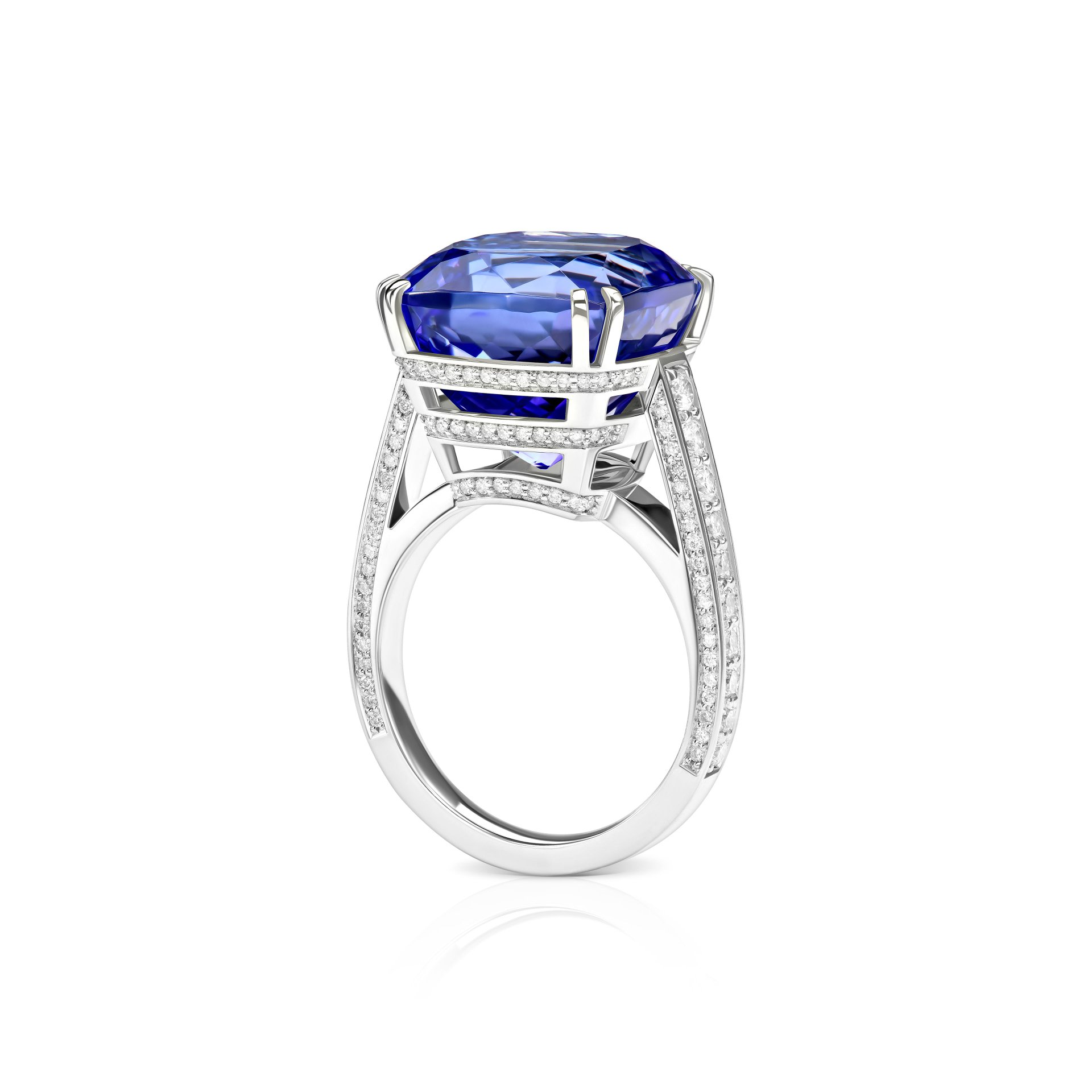 Архитектурная композиция оправы позволяет максимально раскрыть игру света в танзаните и боковых камнях. Белое золото идеально дополняет холодный блеск драгоценных камней, создавая изысканный контраст. Это украшение подойдет для ценителей элегантных и утонченных изделий, которые станут центральным элементом образа.