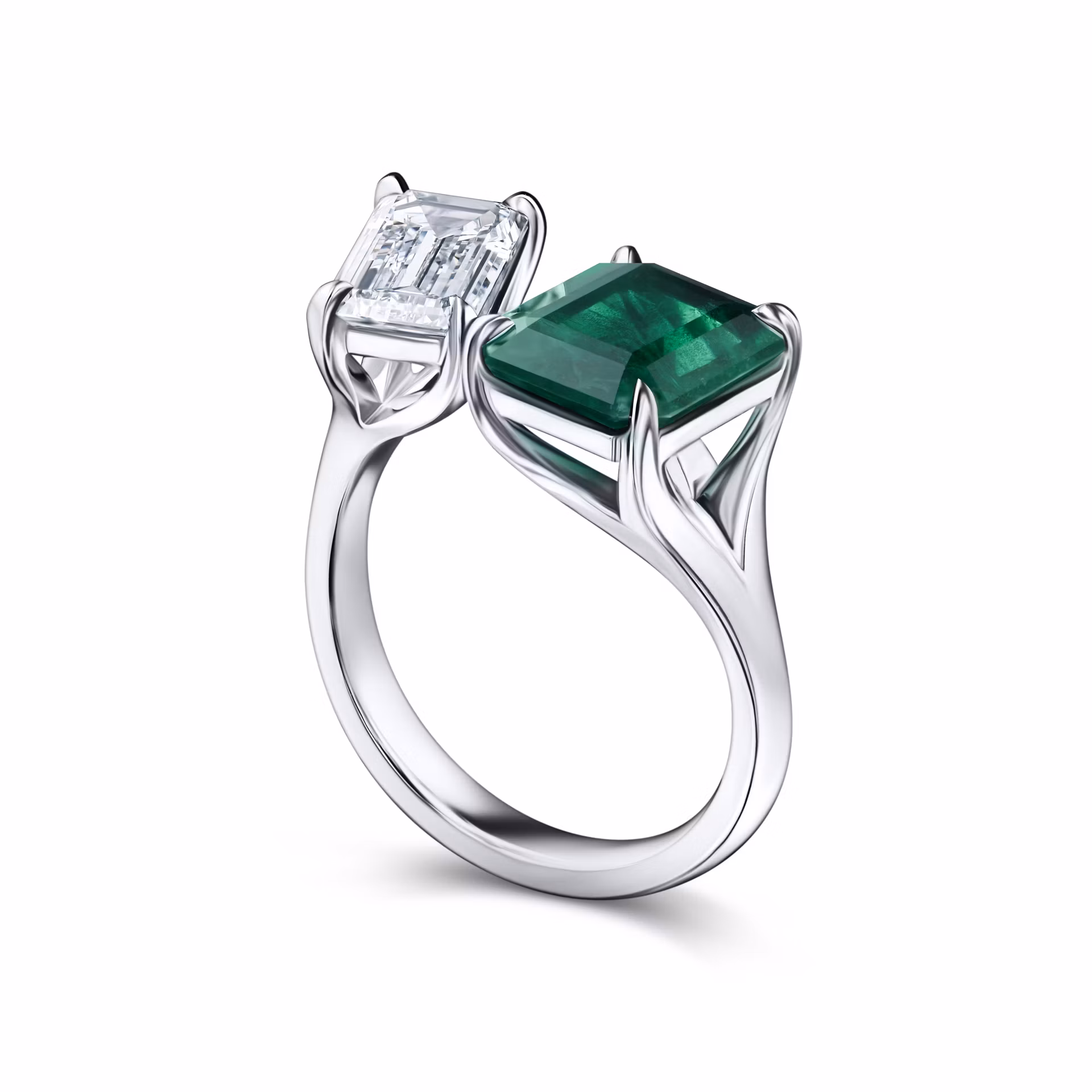 Кольцо "Toi et Moi" с изумрудом 2.30 карата и бриллиантом 1.21 карата представляет собой гармоничное сочетание двух драгоценных камней, выполненное в белом золоте. Центральный изумруд весом 2.3 карата обладает насыщенным зелёным оттенком и классической огранкой, которая подчёркивает глубину цвета и природную игру света. Рядом расположен бриллиант весом 1.21 карата, ограненный в изящной прямоугольной форме, что создаёт визуальный баланс и акцентирует внимание на деталях.