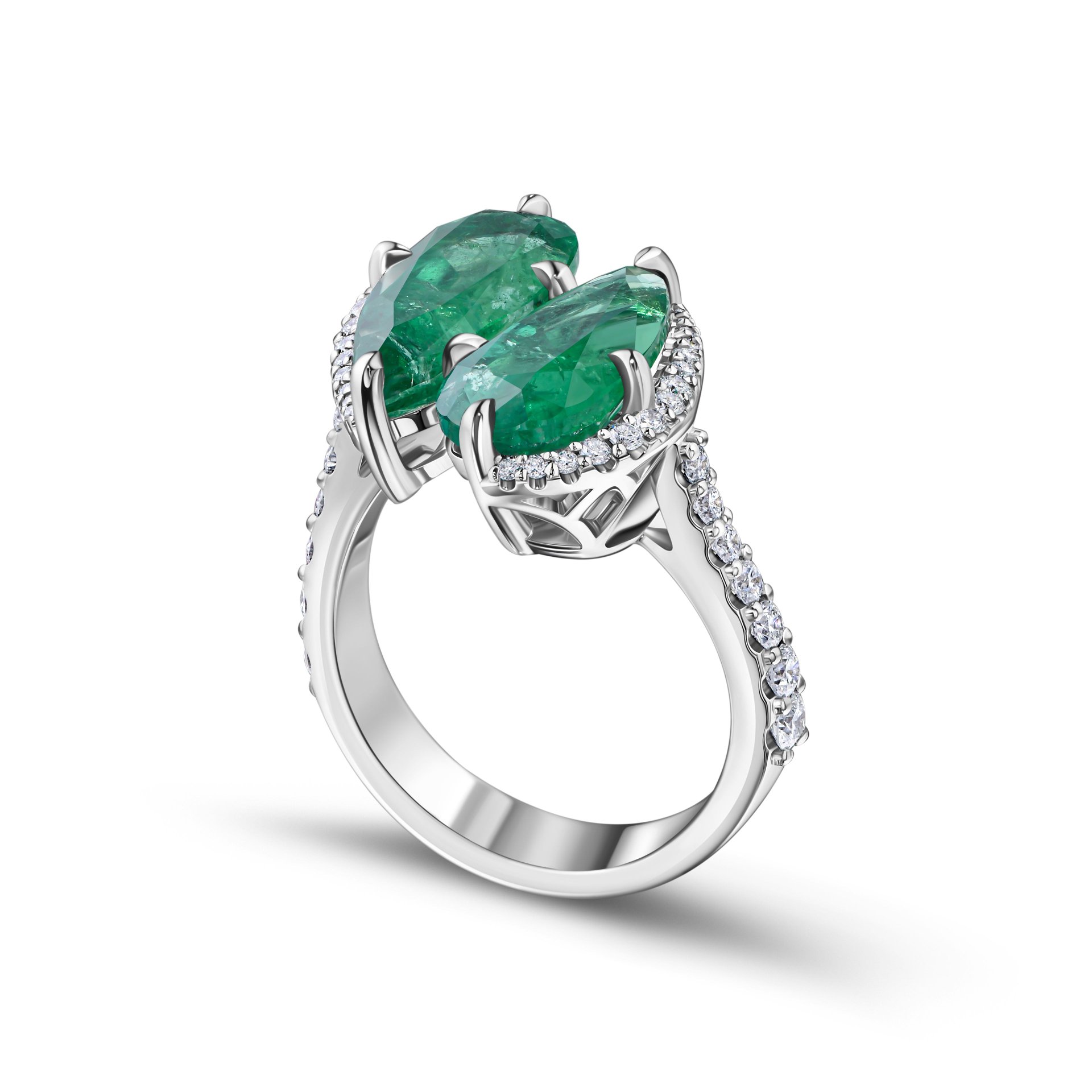 Кольцо с изумрудами 2.70 карат и 2.84 карата представляет собой изящное сочетание двух крупных камней грушевидной огранки, каждый из которых привлекает внимание насыщенным зелёным оттенком и естественной текстурой. Центральные изумруды весом 2.7 и 2.84 карата закреплены в белом золоте, что подчёркивает их глубину и прозрачность. Дополнительное украшение в виде аккуратной линии мелких бриллиантов, обрамляющих каждый из камней, добавляет изделию лёгкости и визуального объёма, создавая эффект плавного перехода от центра к кольцу.