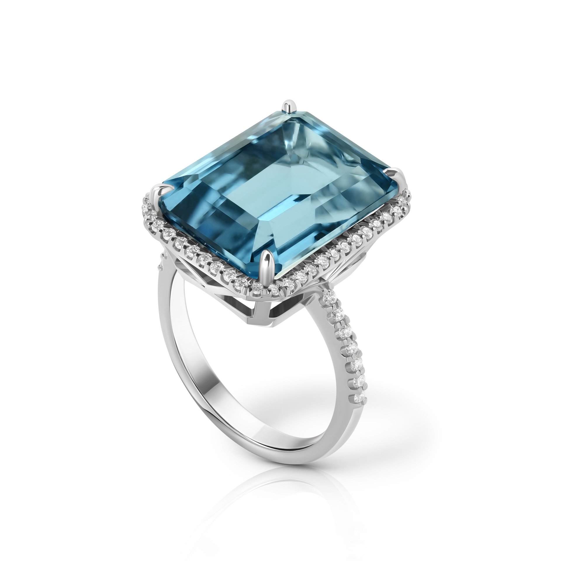 Кольцо с топазом 13.70 карат — это элегантное изделие от ювелирной дизайн-студии Parure Atelier. Центральный камень, топаз огранки «октагон», обладает глубоким насыщенным голубым оттенком, подчеркивающим его природную чистоту и блеск. Топаз надежно закреплен в оправе из белого золота 750 пробы, которое добавляет украшению изысканности.