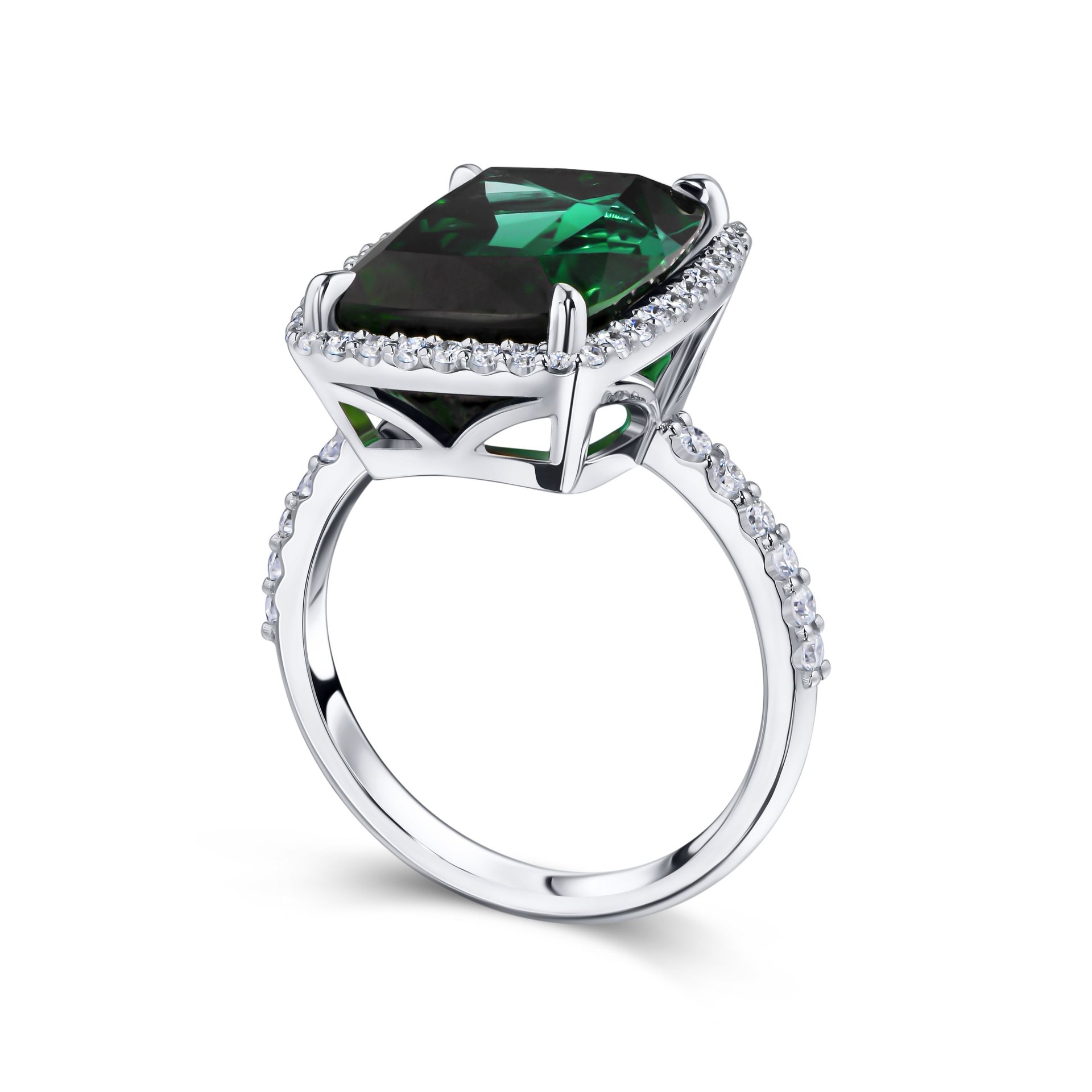 Кольцо с турмалином 8.18 карат привлекает внимание глубоким зелёным оттенком центрального камня, который выгодно подчёркивается огранкой с множеством граней, создающих игру света и объёма. Турмалин весом 8.18 карата занимает основное место в композиции, окружённый аккуратным рядом мелких бриллиантов, которые усиливают выразительность и добавляют изящности изделию. Белое золото, использованное в оправе и кольце, подчеркивает насыщенность цвета главного камня и придаёт украшению современный и лаконичный вид.
