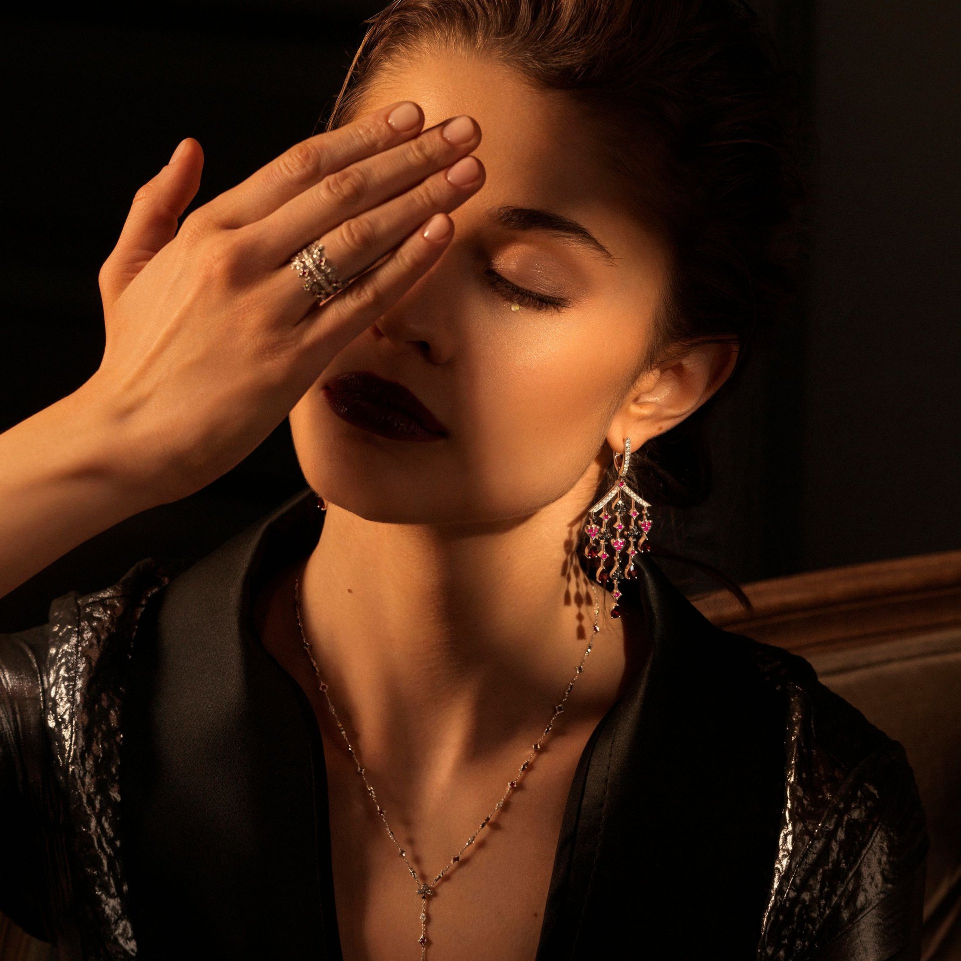 Колье-галстук «Трефы и бубны» – украшение с выразительным дизайном и сложной ювелирной композицией. В нем сочетаются бриллианты, рубины, гранат и шпинель, гармонично расположенные на звеньях белого золота. Центральный элемент – гранат грушевидной огранки весом 0.61 карат, дополненный россыпью круглых бриллиантов и черных бриллиантов, создающих контрастное сияние.