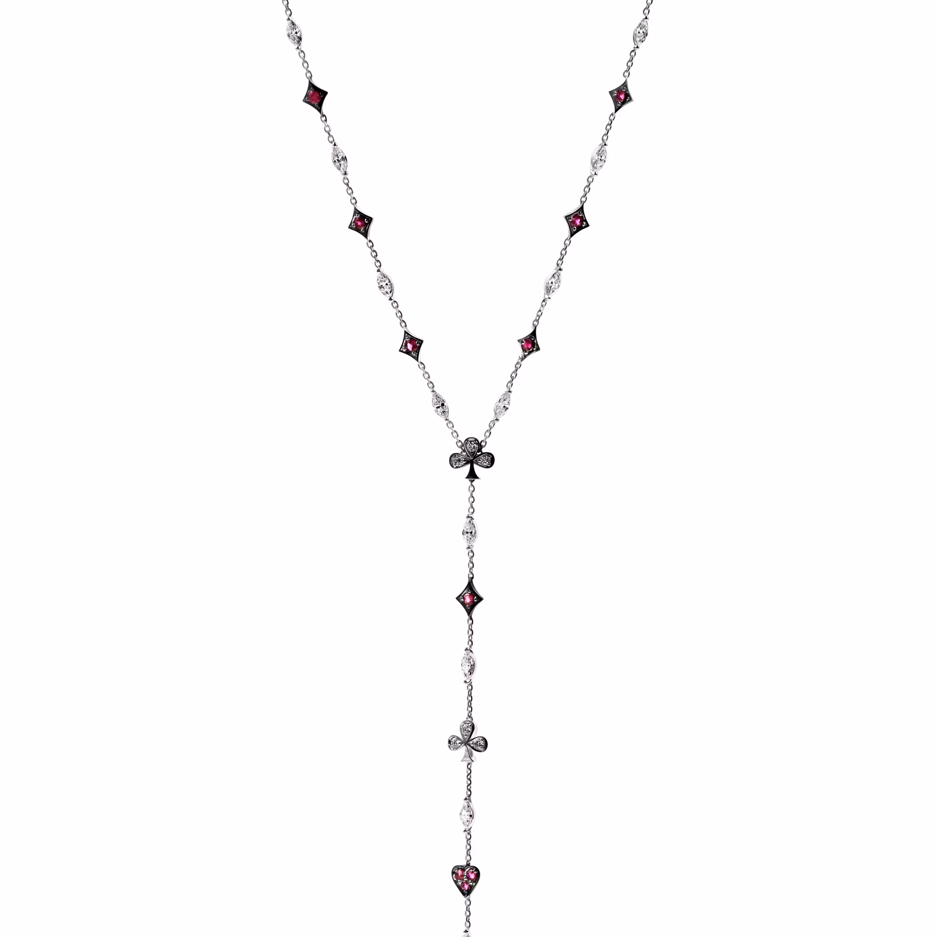 Боковые вставки включают шпинель (0.567 карат) и рубины (0.072 карата), формируя динамичный узор. Черные бриллианты подчеркивают стильное сочетание драгоценных камней. Дизайн колье отсылает к карточной символике, делая его оригинальным аксессуаром.