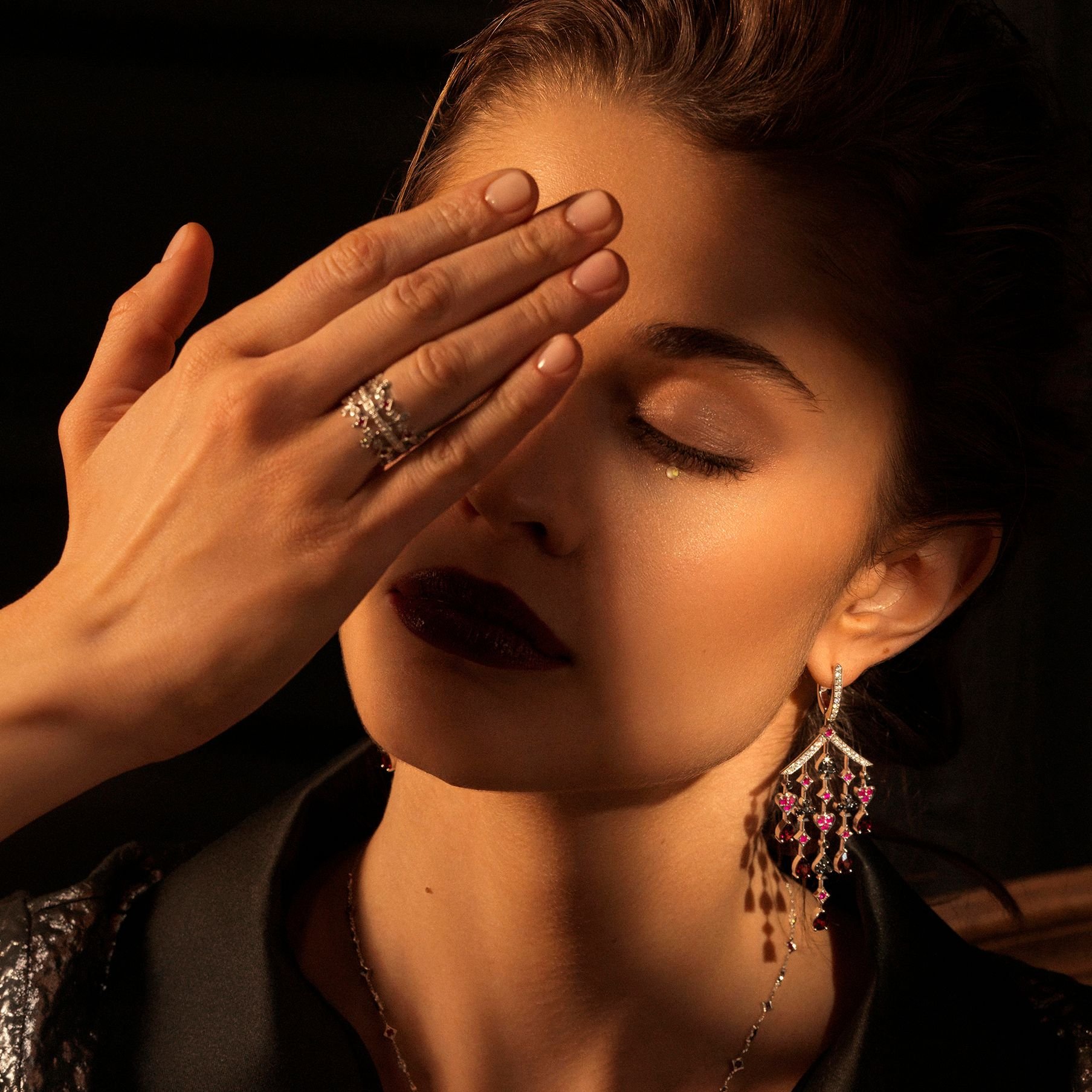 Кольцо «Трефы и бубны» — это настоящее произведение ювелирного искусства, которое привлекает внимание своим изысканным дизайном. В центре композиции находятся бриллианты и рубины общей массой 0.44 карата, гармонично сочетающиеся с игрой света на поверхности белого золота. Боковые бриллианты, весом около 0.819 карата, добавляют украшению особую утонченность, подчеркивая каждую деталь.