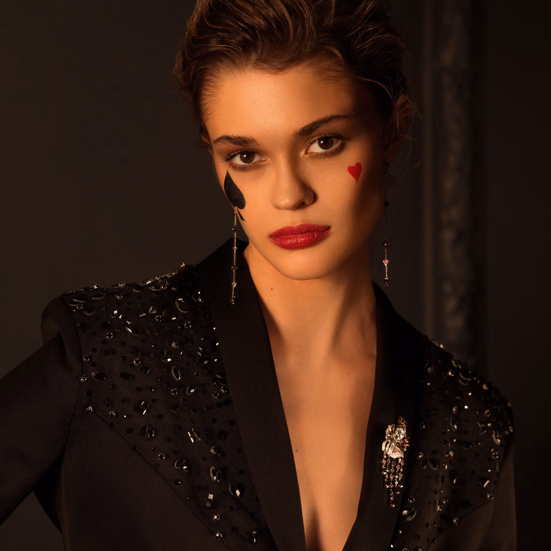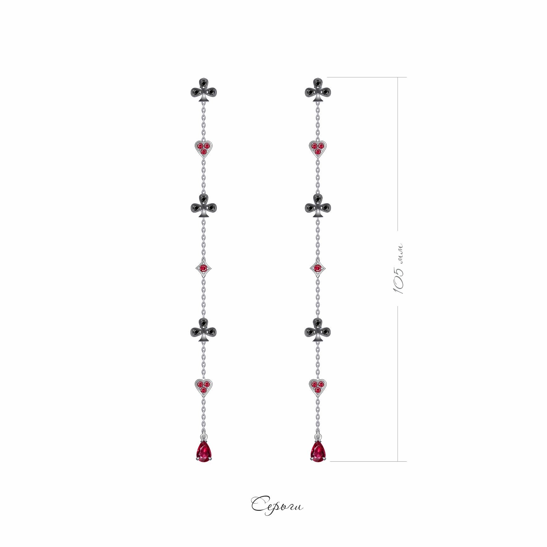 Каждая серьга украшена чередующимися мотивами треф и черв, создающими уникальный визуальный ритм. Рубины и гранаты добавляют яркие акценты, подчеркивая индивидуальность и стиль обладательницы. Эти драгоценные камни не только украшают, но и придают серьгам особую глубину и насыщенность цвета.