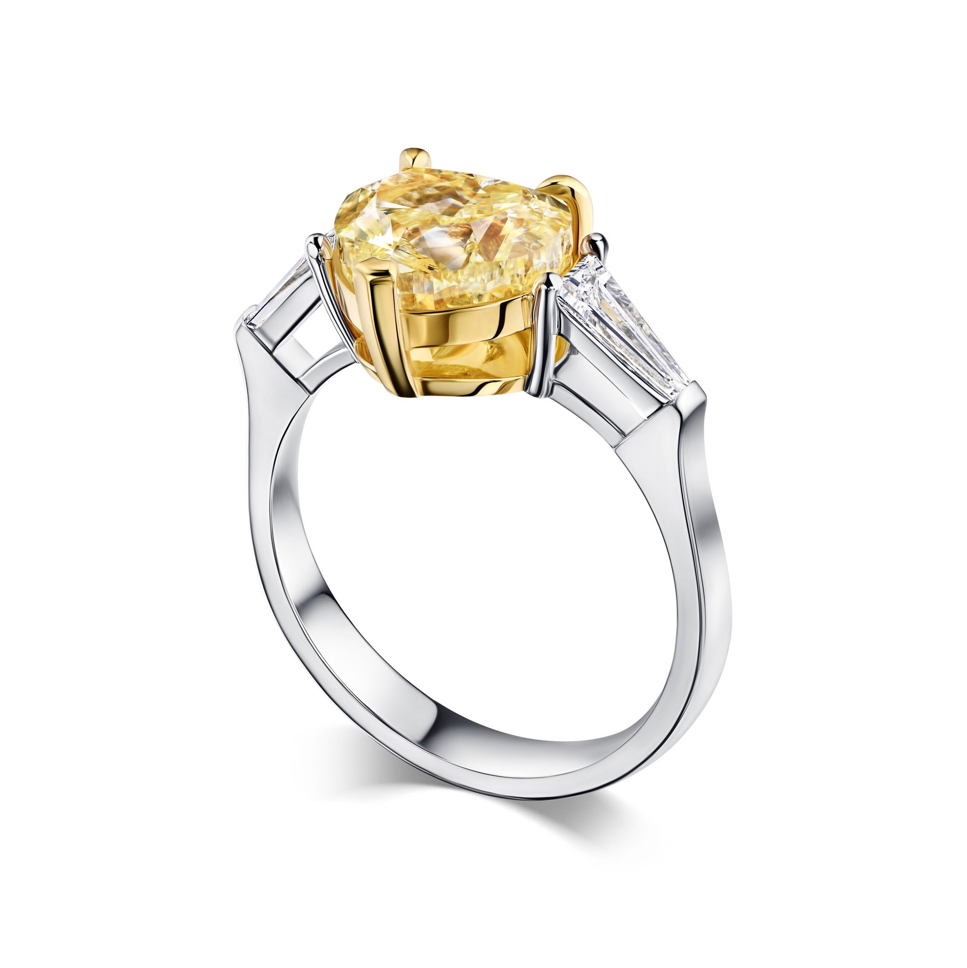Кольцо с желтым бриллиантом 3.01 карат привлекает внимание необычной формой центрального камня — сердце, что придаёт изделию особую выразительность и символичность. Желтый бриллиант весом 3.01 карата занимает ключевое место в дизайне, его оттенок мягко подчёркивает благородство металла. По бокам расположены два белых бриллианта в форме трапеции, которые усиливают игру света и добавляют гармонию композиции. Основа выполнена из белого золота, что создаёт контраст с тёплым цветом центрального камня и подчёркивает его яркость.