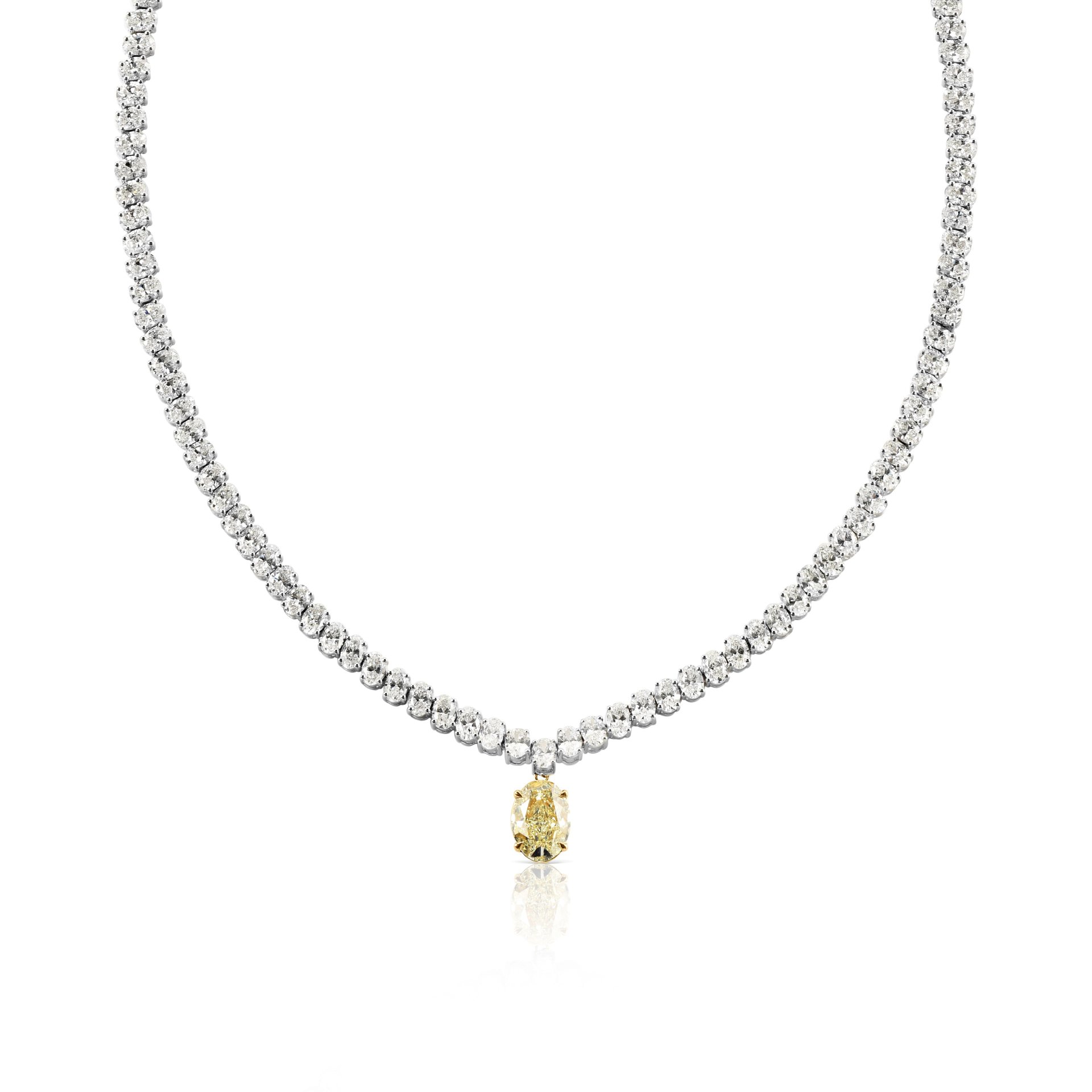 Колье «Аврора» – это классическое теннисное украшение с элегантной подвеской. Центральный камень – желтый бриллиант овальной огранки весом 3.05 карата, который привлекает внимание своим теплым оттенком. Он дополнен россыпью бесцветных бриллиантов общей массой 23.68 карата, создающих изысканное сияние.