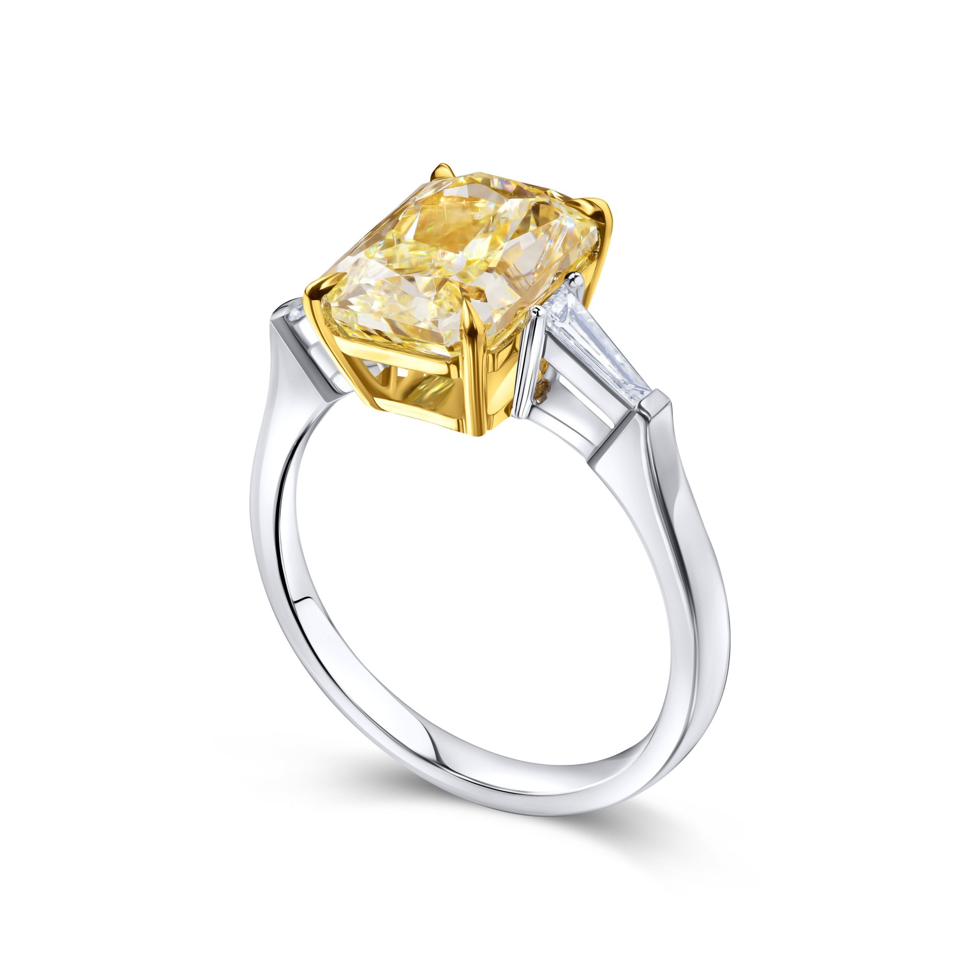 Вдохновляющее кольцо с желтым бриллиантом «радиант» 3.58 карат — это истинное воплощение элегантности и изысканности. Центральный камень, сияющий ярким солнечным светом, привлекает внимание своим насыщенным оттенком и утонченной огранкой. Его окружает пара изящных боковых бриллиантов с огранкой тапер-багет, весом около 0.178 карат каждый, которые подчеркивают великолепие центрального элемента и добавляют композиции завершенности.