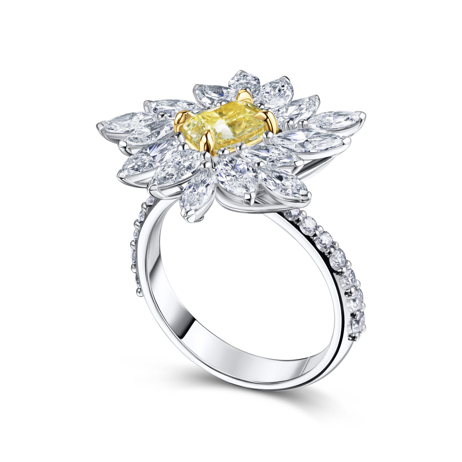 Кольцо с желтым бриллиантом 1.13 карата привлекает внимание сочетанием выразительного центрального камня и изящной огранки боковых бриллиантов. Центральный желтый бриллиант весом 1.13 карата закреплен в желтом золоте, что подчеркивает его оттенок и придает изделию особую глубину цвета. Окружающие камни выполнены в форме маркиз, создавая эффект цветочного узора и визуально расширяя композицию. Металл основания — белое золото, обеспечивающее нейтральный фон и контраст, который выгодно выделяет желтый бриллиант.