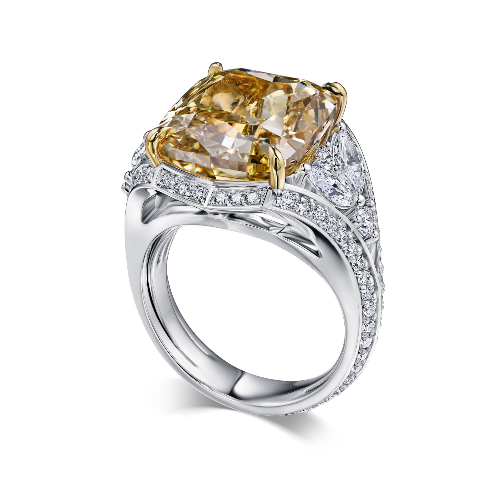 Кольцо с желтым бриллиантом 12.52 карата привлекает внимание крупным центральным камнем насыщенного оттенка. Огранка подчеркивает глубину и игру света в камне, создавая эффект многогранного сияния. Основной бриллиант надежно закреплен четырьмя золотыми лапками, которые гармонично сочетаются с белым золотом основы украшения. По бокам расположены небольшие белые бриллианты, аккуратно вписанные в дизайн, они добавляют дополнительный блеск и визуальный баланс композиции. Особенность модели — сочетание теплоты желтого камня и холодного оттенка металла, что придает изделию современный и в то же время сдержанный вид. Это украшение — результат работы ювелирной дизайн-студии Parure Atelier, где внимание к деталям и качество исполнения остаются на высоком уровне. Для тех, кто ищет выразительный акцент в образе, это кольцо станет удачным выбором. Если хотите рассмотреть другие варианты, рекомендуем ознакомиться с нашей коллекцией кольца.