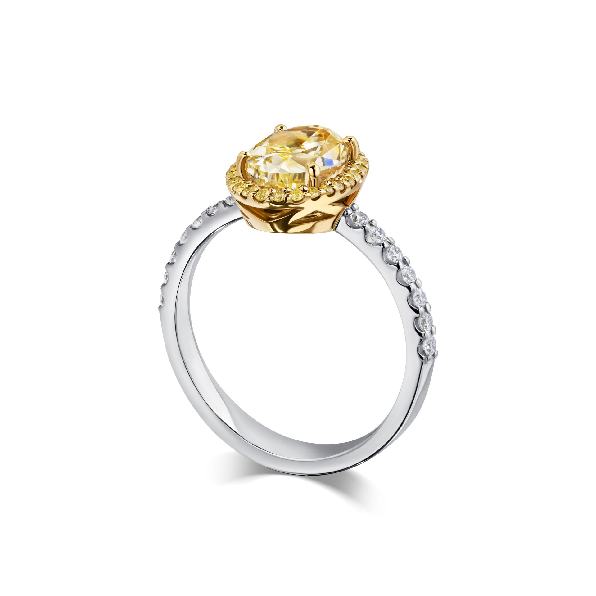 Кольцо с желтым бриллиантом 2.02 карата — это воплощение утонченной элегантности и яркости. Центральный камень, овальной формы, обрамлен россыпью мелких желтых бриллиантов, которые усиливают его сияние и добавляют глубину. Белое золото подчеркивает чистоту и блеск каждого элемента, создавая гармоничный контраст с теплотой желтых оттенков.