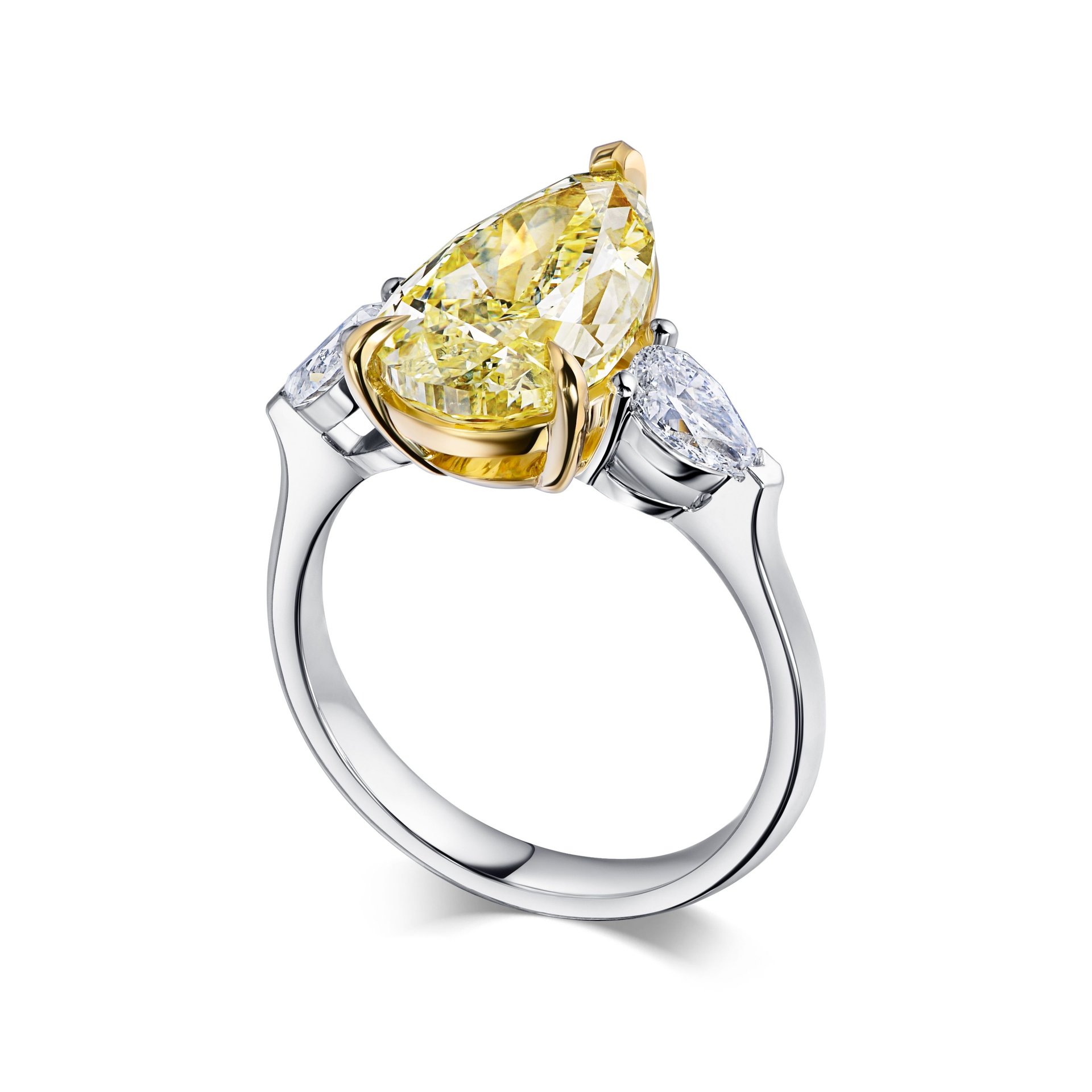 Кольцо с желтым бриллиантом 4.14 карата привлекает внимание своим выразительным дизайном и тщательно продуманной композицией. Центральный камень — желтый бриллиант весом 4.14 карата — выполнен в форме капли, что подчеркивает его уникальную игру света и цветовую глубину. По обеим сторонам от основного камня расположены два бриллианта классической огранки, которые создают гармоничный контраст и усиливают сияние центрального элемента. Изделие выполнено из белого золота, что придает украшению современный и лаконичный вид, а также выгодно подчеркивает насыщенный оттенок желтого бриллианта.