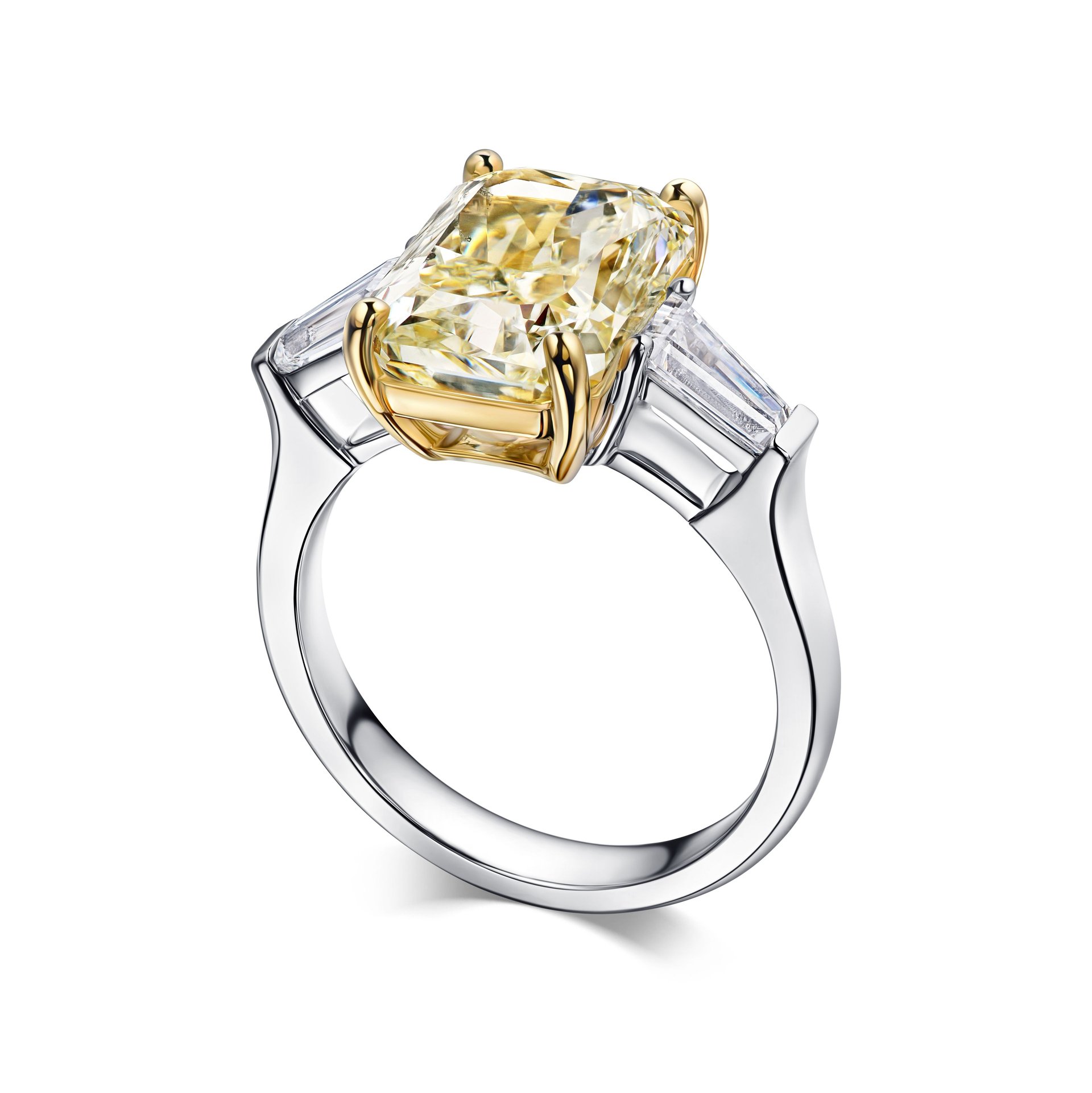 Кольцо с желтым бриллиантом 5.01 карат привлекает внимание своей выразительной центральной вставкой — крупным камнем насыщенного оттенка, который гармонично сочетается с белым золотом. По бокам расположены два бриллианта в форме багета, которые подчеркивают геометрическую чистоту дизайна и добавляют композиции легкости. Такой выбор огранки усиливает игру света и делает акцент на главном камне, раскрывая его природную красоту и глубину цвета.