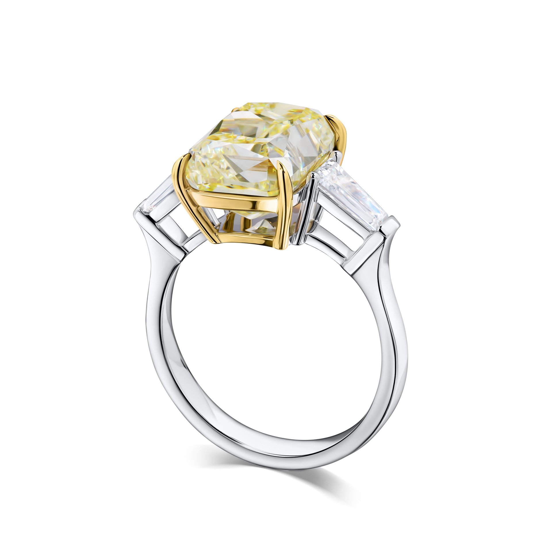 Кольцо «Golden Dream» — это воплощение элегантности и утонченности. В центре композиции сияет желтый бриллиант весом 5.32 карата, который привлекает внимание своим насыщенным оттенком и изысканной огранкой. Его теплое сияние дополняют боковые бриллианты огранки тапер-багет, весом около 0.26 и 0.23 карата, создавая гармоничную игру света и тени.