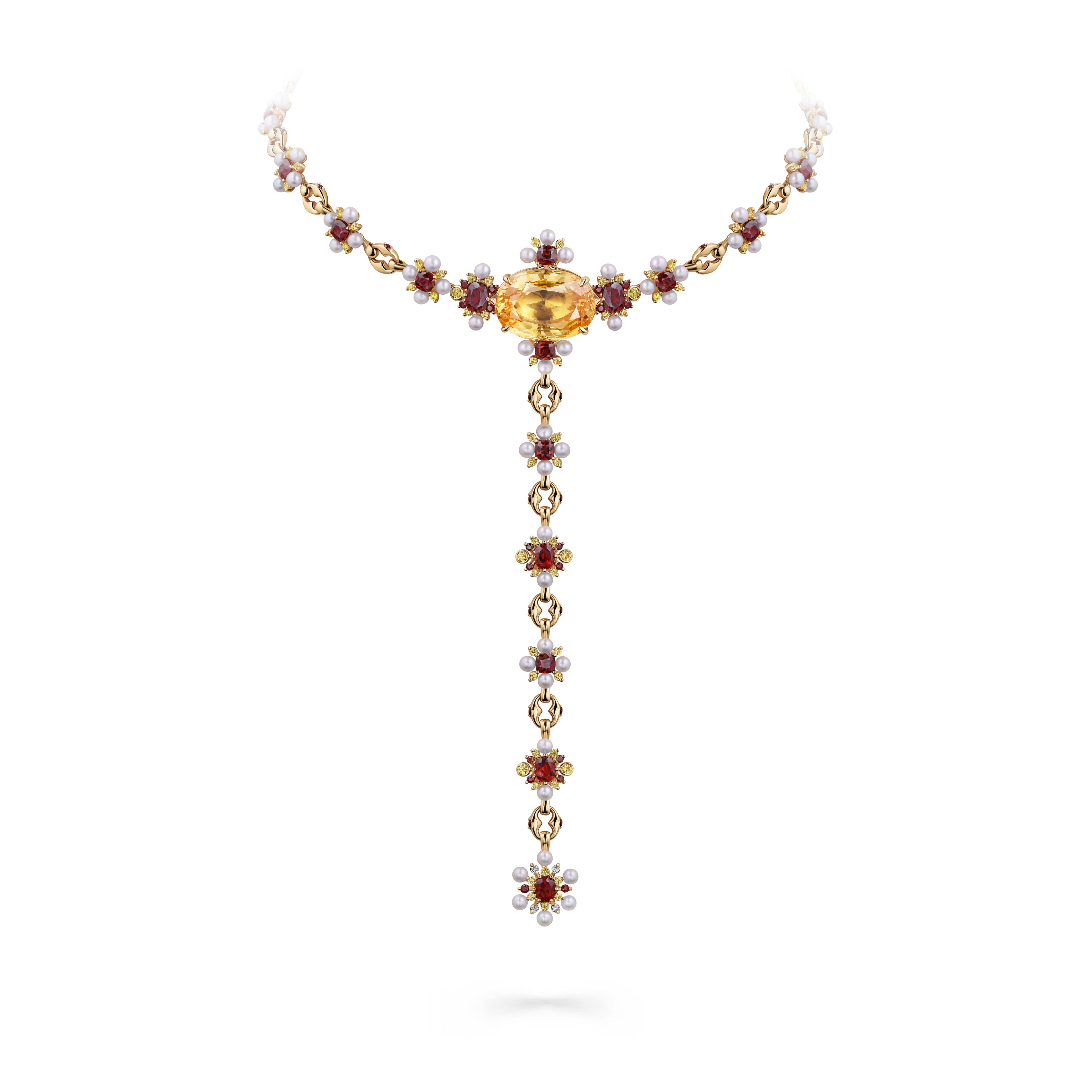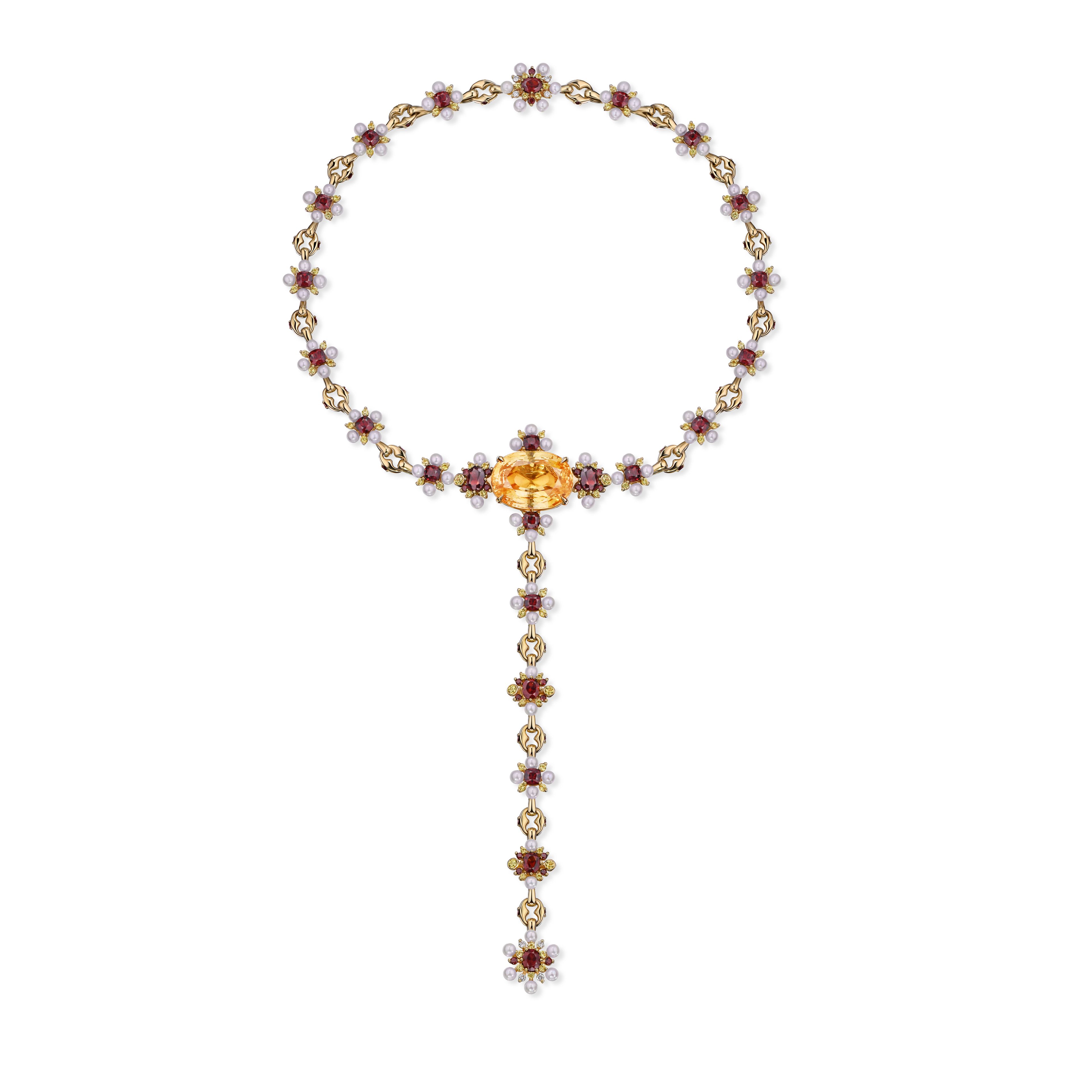 Изящное колье выполнено в стиле итальянского барокко. В центре сверкает жёлтый сапфир весом почти 23 карата. Цвет и фактура переплетаются в гармонии бриллиантов, жемчуга, гранатов и сапфиров. Украшение излучает тёплое сияние, как и образ святой на полотне Дольчи.