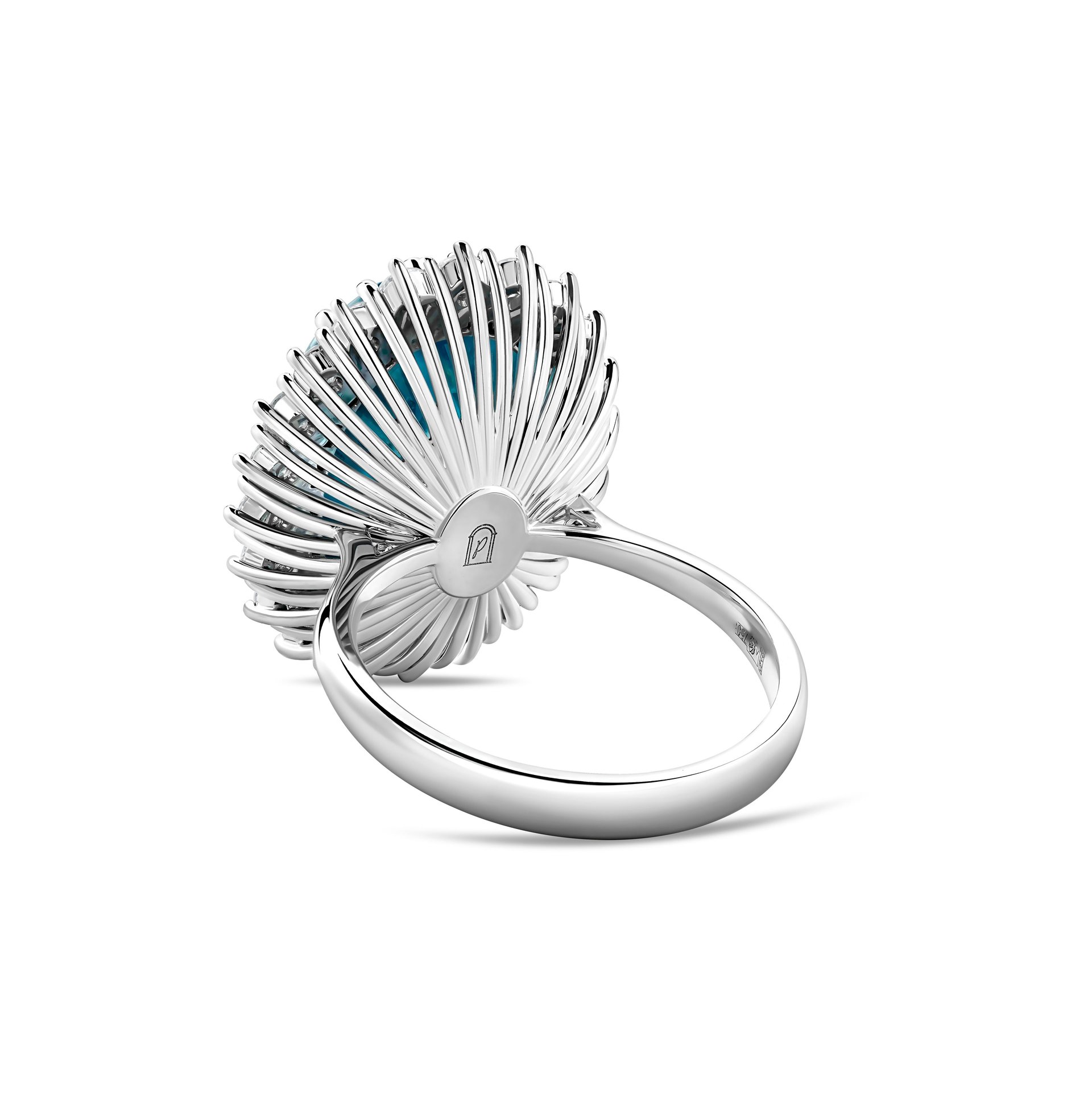 Это элегантное кольцо от ювелирной дизайн-студии Parure Atelier создано для тех, кто ценит уникальные ювелирные изделия с выразительным дизайном. Центральный камень – циркон весом 24.74 карата, выполненный в классической овальной огранке, притягивает взгляд насыщенным голубым оттенком и впечатляющей игрой света. Камень окружён россыпью бриллиантов общей массой 1.88 карат, огранённых кругом, что добавляет кольцу выразительный блеск и подчёркивает чистоту центрального камня. Оправа из белого золота 750 пробы подчёркивает холодный блеск драгоценных камней, придавая украшению изысканную гармонию. Тщательно продуманная конструкция и безупречная отделка делают это кольцо истинным произведением ювелирного искусства, идеально подходящим для особых случаев.