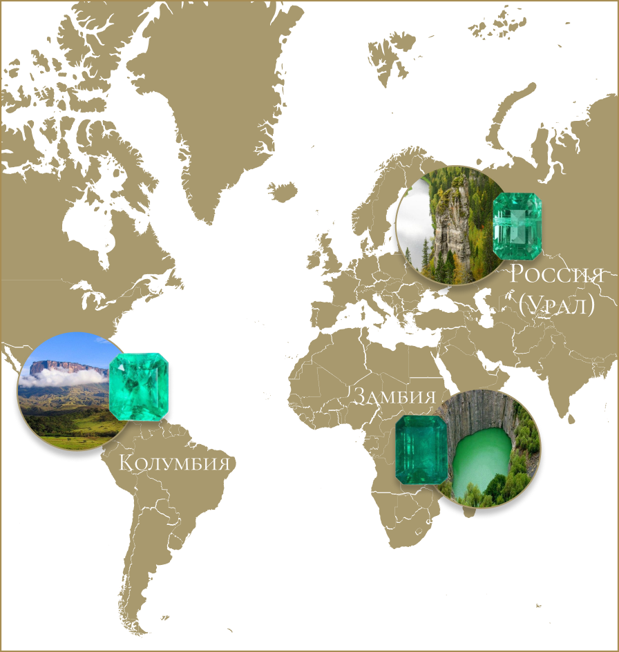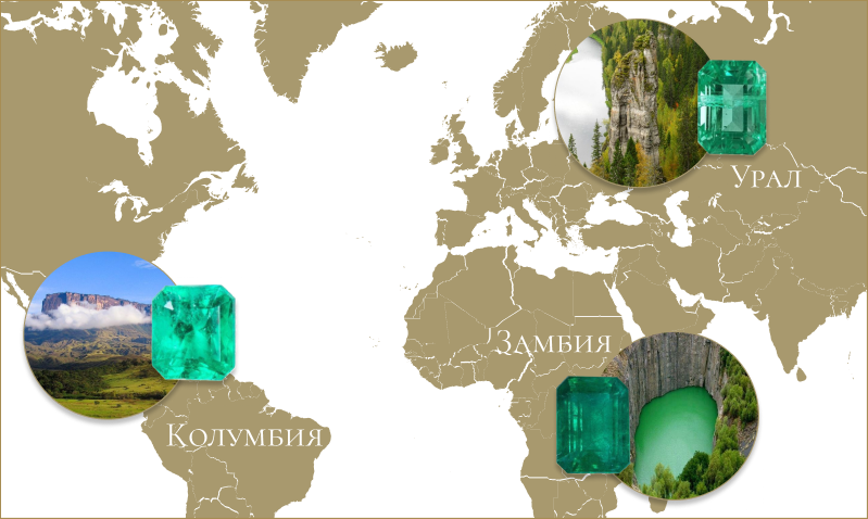 в Колумбии и Замбии. Еще одно известное месторождение изумрудов — это, конечно же, Урал. Изумруды из Колумбии считаются более ценными и желанными, при равных характеристиках камни из Замбии будут более доступными, поскольку история месторождений в Африке насчитывает десятки,